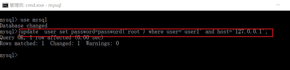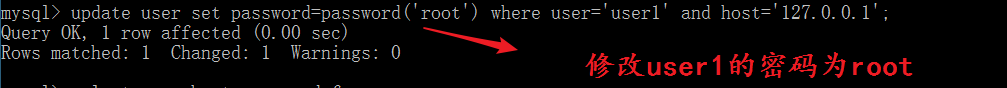 update user set password=password(‘root’) where user=’user1′ and host=’127.0.0.1′;