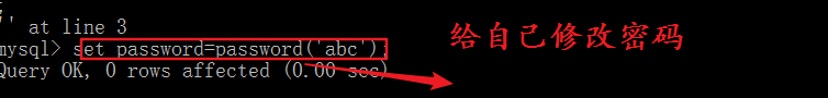 Set password=password(‘abc’);