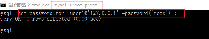 set password for user1@’127.0.0.1′ =password(‘root’) ;
