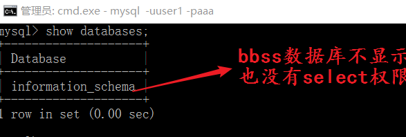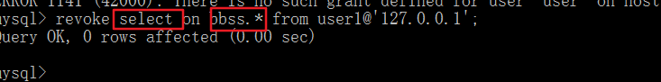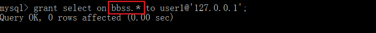 grant select on bbss.* to user1@’127.0.0.1‘; —*代表所有的表