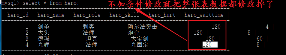 注意:修改表数据的时候一般都要指定修改的条件,如果修改不指定条件的话会把整张表的数据都修改