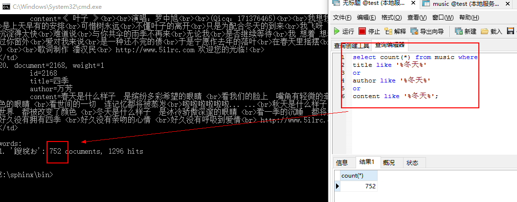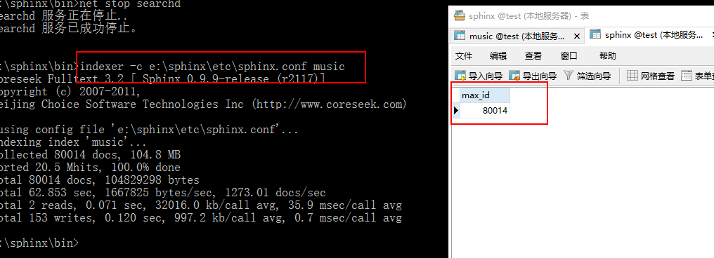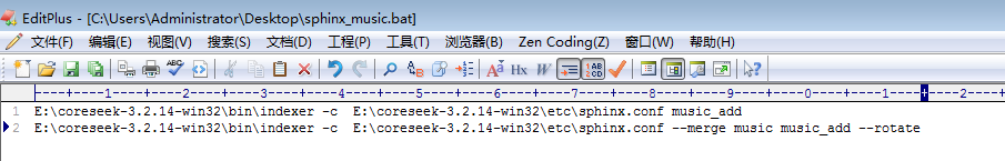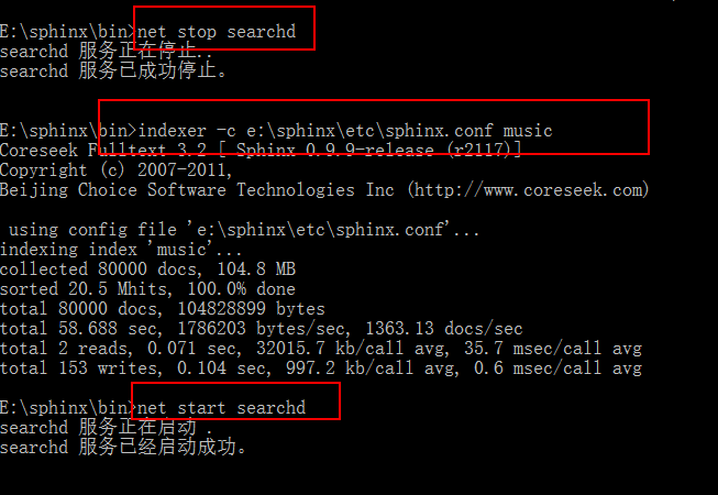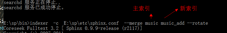 e:\sp\bin\indexer -c e:\sp\etc\sphinx.conf –merge music music_add –rotate