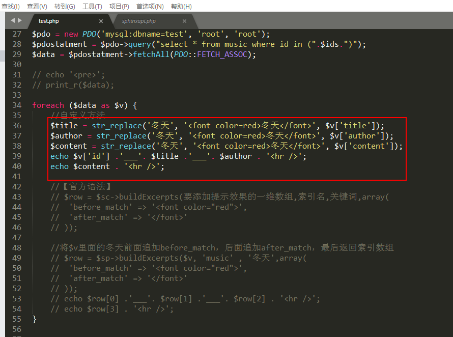 $author = str_replace(‘冬天’, ‘<font color=red>冬天</font>’, $v[‘author’]);