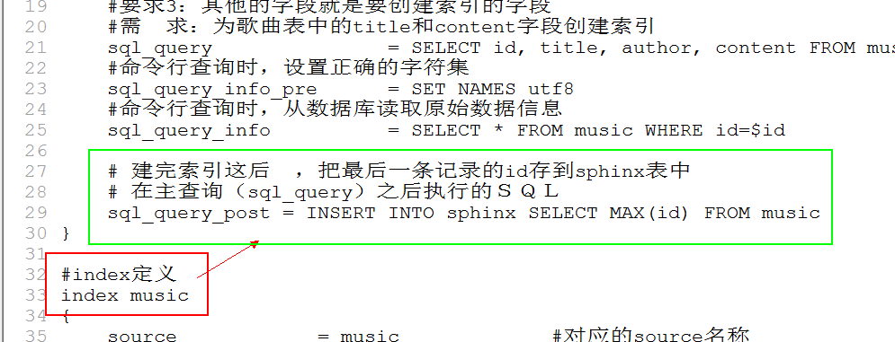 步骤2.1 修改music索引的数据源,增加下属代码,用户当music第一次执行后记录已经创建索引数据的最大id