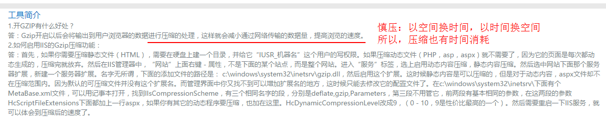 gzip开启以后会将输出到用户浏览器的数据进行压缩的处理,这样就会减小通过网络传输的数据量,提高浏览的速度。(以空间换时间,以时间换空间)