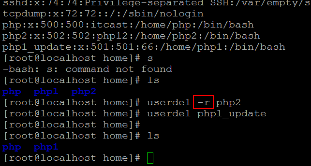 注意:-r 表示同时删除家目录(注:默认不删家目录)