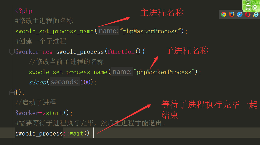 等待子进程退出:swoole_process:wait()效果就是只有所有子进程全部退出了,这个主进程才退出。