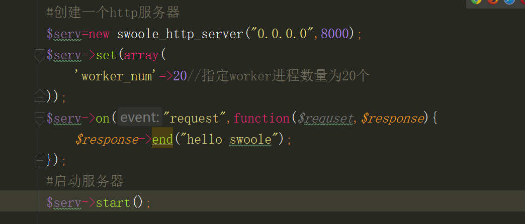 $serv->on(“request”,function($request,$response){