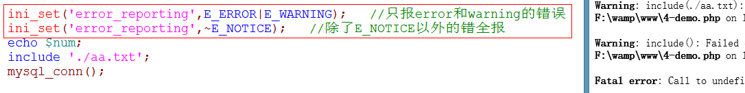 notice和warning错误后代码继续执行,error错误后代码终止执行。